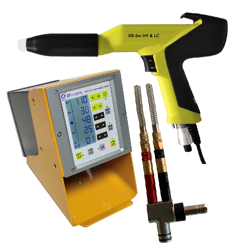 XR5-100m 手动喷粉枪的基本组合可以做为设备的更新喷枪, 沿用旧的供粉桶或是振吸给粉装置, 或是自动喷涂设备的修补喷枪, 公用自动喷枪的供粉桶, 喷枪设计适用于聚酯、环氧树脂、丙烯酸等多种粉末涂料。