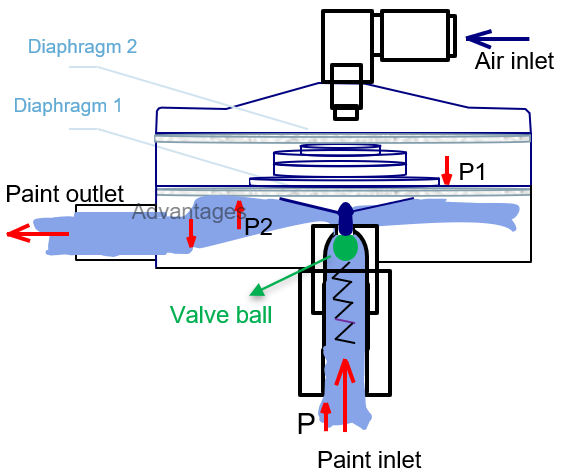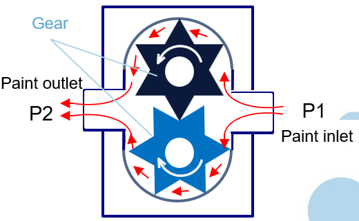 | Working Principle | P1 (air pressure or spring force) pushes the valve ball open, allowing paint to enter the chamber P2 (paint pressure) reduces the valve ball gap, decreasing paint flow and subsequently lowering P2 pressure The paint output is determined by the balance between three forces: the inlet paint pressure, the outlet pressure P2 (chamber pressure), and the air pressure (or spring force) on the P1 diaphragm. | Variable frequency motors and servo motors drive gears to rotate The paint in the space between gear tooth tips and the pump body is carried by gear rotation to the pump outlet and discharged outside the pump body The rotation speed represents the volume of paint discharged between gears, which is converted digitally for paint output data management | Precision Servo Linear Control Measurement |